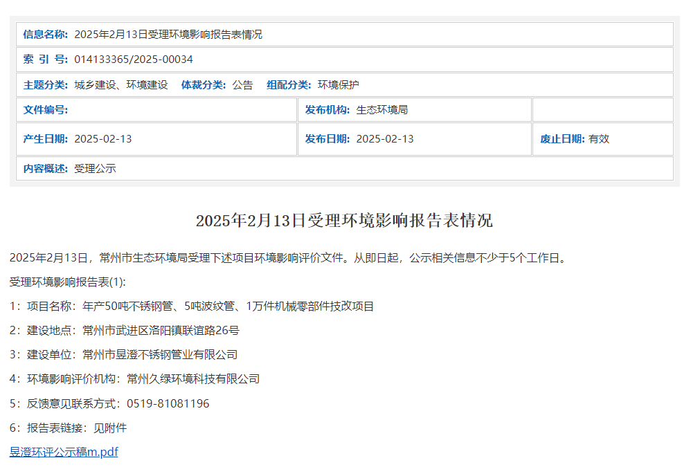 2025年2月13日,常州市生態(tài)環(huán)境局受理常州市昱澄不銹鋼管業(yè)有限公司年產(chǎn)50噸不銹鋼管、5噸波紋管、1萬件機械零部件技改項目環(huán)境影響報告表并對外進行公示,公示期:從即日起,公示相關信息不少于5個工作日。